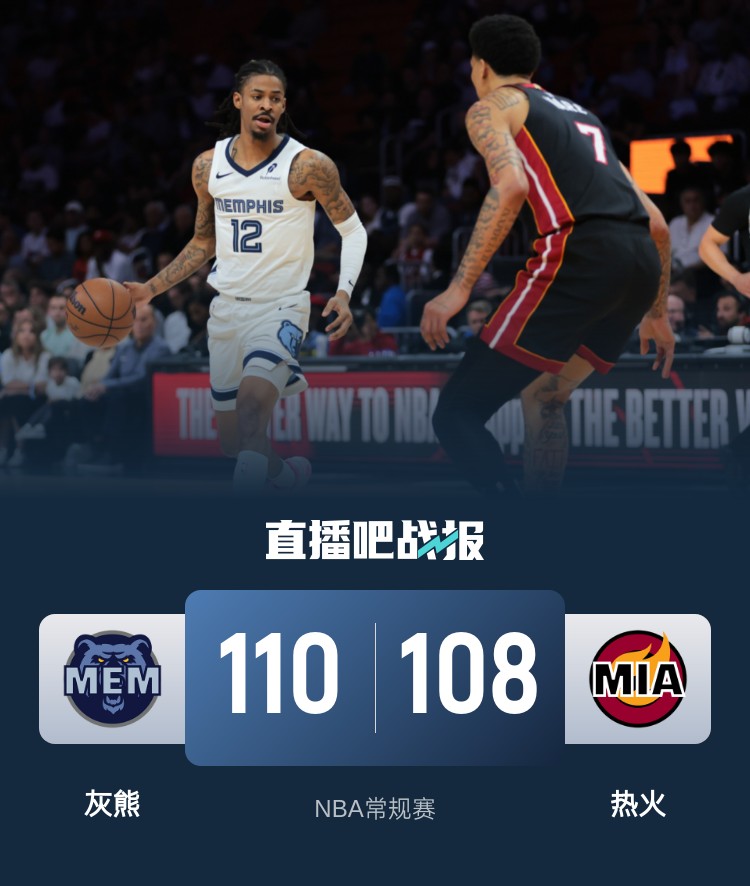 上半场,阿德巴约率先发力带队打出9-0的开局,灰熊及时回暖,内外开花迅速扳平比分,次节热火占得先机取得8分领先,灰熊轰出11-2的攻击波强势反超,双方你来我往打得难解难分,半场战罢热火50-49领先灰熊1分。下半场,两端依旧难分伯仲,比分交替领先,末节双方争夺陷入白热化,关键时刻小贾伦飙中三分,阿德巴约大帽莫兰特,希罗扳平后莫兰特大撤步中投压哨绝杀。最终,灰熊110-108险胜热火,结束4连败的同时终结热火6连胜。