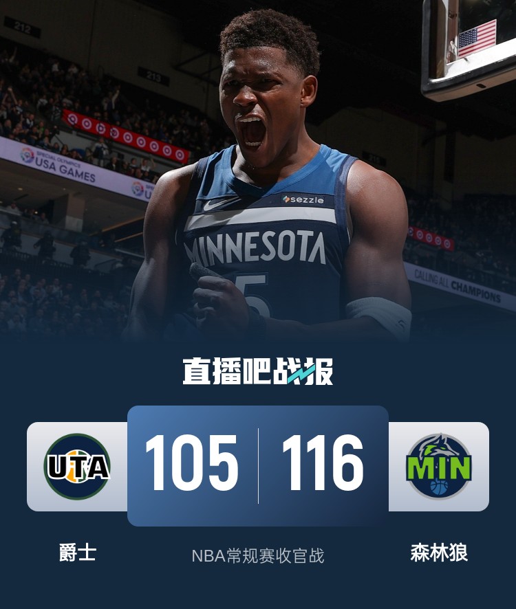 比赛上来,爵士就反客为主打出8-2的开局取得领先,不过森林狼还是在实力上占优此后完成反超,次节森林狼的命中率下滑明显,尤其是外线频频打铁,单节得分勉强达到20分,爵士把握住机会抹平分差并保持拉锯,半场结束时森林狼仅领先1分;下半场回来,爱德华兹突然爆发,单节轰下18分带队将分差拉开到两位数,末节爵士也没有再获得机会,最终森林狼力克爵士锁定西部前六。