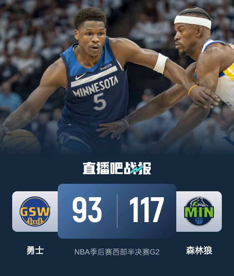 比赛上来,勇士迟迟无法进入状态在前五分钟的时间里一分未得,森林狼抓住机会轰出一波13-0的完美开局,整个第一节勇士的进攻都很糟糕单节只拿到15分,次节勇士的表现依旧没有好转,不过森林狼的命中率也是下滑明显,爱德华兹上篮落地踩到TJD脚受伤回到更衣室,半场结束时勇士还落后17分;下半场回来,勇士发起了反扑势头并一度将分差追到个位数,但这个势头并没有延续太长时间,森林狼在节末给出回应,分差反而扩大到二十分,末节勇士没有再获得任何机会,最终森林狼轻取勇士,将大比分追至1-1平。