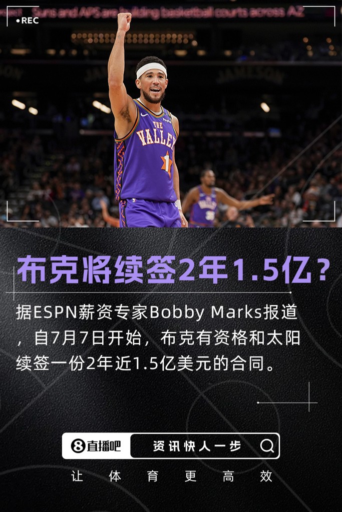 Marks表示,太阳球星德文-布克从7月7日开始有资格和球队提前续约,截止日期是10月21日。尽管布克在2022年签下的(4年)超2.2亿美元合同还有3年才到期,但他今夏有资格续签两年(1.5亿美元),平均薪资7500万美元将创NBA联盟历史纪录。