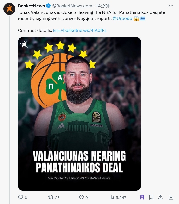 07月04日讯 欧媒BasketNews报道,消息源称,征战了13个赛季的瓦兰丘纳斯即将离开NBA,加盟希腊豪门帕纳辛纳科斯!