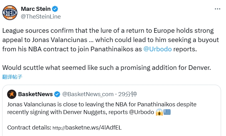 名记Marc Stein确认了这个报道,并表示,联盟消息源确认,重返欧洲对瓦兰有着巨大的诱惑,瓦兰可能会寻求买断自己的合同,从而加盟帕纳辛纳科斯。