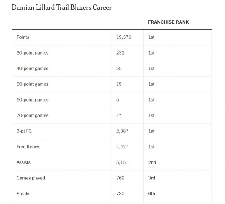 在开拓者队史上,利拉德无疑有重要的意义,利拉德在开拓者得到19376分,队史第一;232次砍下30+,55次砍下40+,15次砍下50+,5次砍下60+,1次砍下70+,2387记三分,4427记罚球,这些都是队史第一;5151次助攻,队史第二;出战769场比赛,队史第三;完成732次抢断,队史第6。