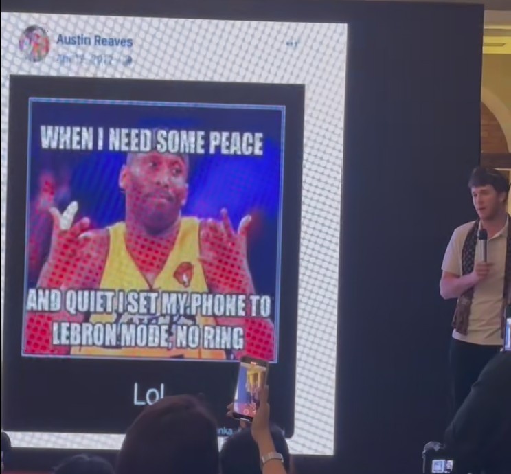 2012年,13岁的里夫斯在社媒发推,配图是科比摊手,配文则是:“当我想安静下来的时候,我会将手机设置为勒布朗模式,不响铃。哈哈。”(不响铃,No Ring,没戒指。当时詹姆斯距离获得自己的第一个总冠军还有2个月的时间)。