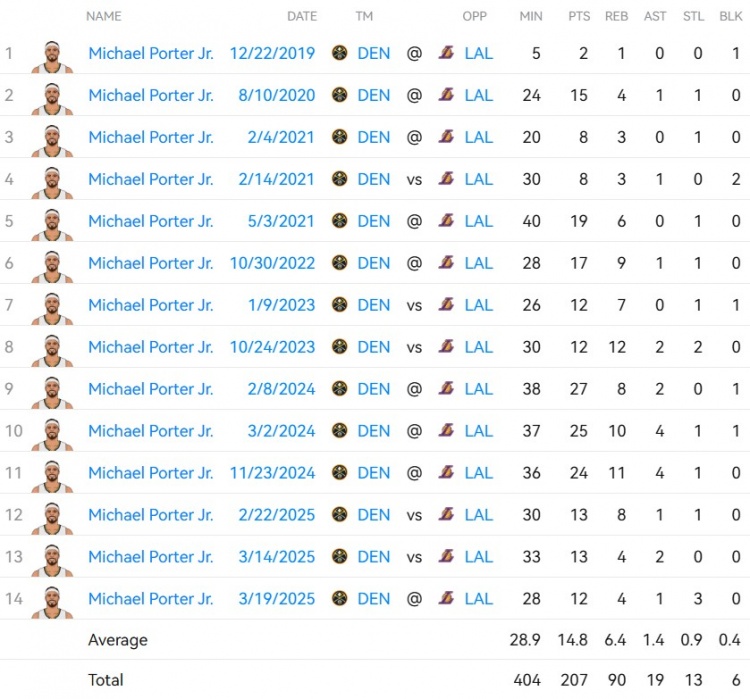 据统计,小波特常规赛生涯面对湖人场均出战28.9分钟,得到14.8分6.4篮板1.4助攻。