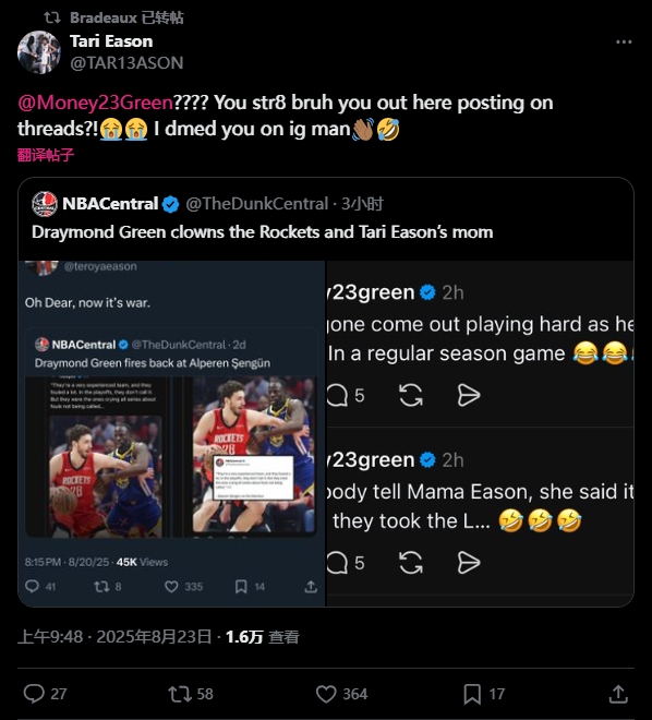 而伊森本人则在Twitter再次回复追梦:“@追梦????你这幼稚鬼竟然躲到Threads来发帖?!我都已经在Ins上私信你了”