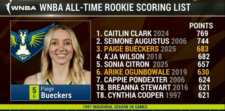 佩奇本赛季总计得到692分194助攻141篮板18盖帽,她的新秀赛季得分超越阿贾-威尔逊(682分)位居历史第三,助攻超越苏-伯德(191记)位居历史第二。