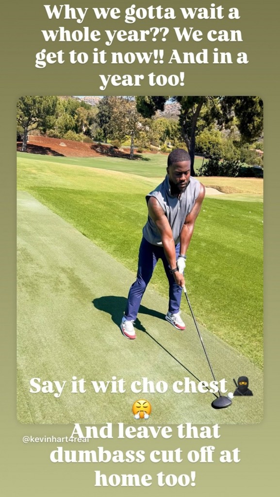 著名影星凯文-哈特晒出自己打高尔夫球的动态,并向詹姆斯发起了挑战:“高尔夫球手凯文正在加载中…… 请在这过程中耐心等待……但是我马上就要找你算账了!!!@詹姆斯 ……我现在公开向你发起挑战,在一年后的9月17日进行18洞的较量……我要让全世界看到我如何击败你!!!把这当作一个威胁和警告!!!顺便说一句,我要把无袖高尔夫球衫变成我的标志!!!阳光下秀出肌肉,宝贝们!!! ”