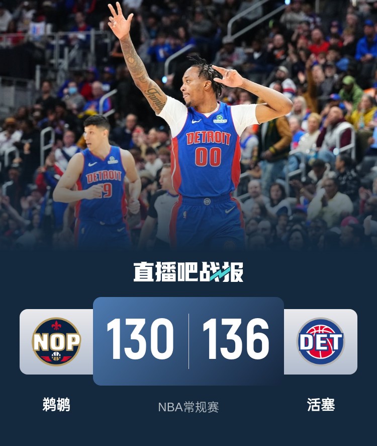 上半场,双方开场势均力敌,比分交替领先,活塞持续发力打出13-3的攻击波确立优势,次节双方围绕10分分差展开拉锯战,鹈鹕内外开花努力追赶,活塞稳扎稳打占据场上主动,半场战罢活塞68-59领先鹈鹕。下半场,活塞命中率下降,鹈鹕趁势轰出15-5的攻势反超比分,末节双方争夺陷入白热化,关键时刻活塞持续发力内外开花杀死比赛。最终,活塞136-130力克鹈鹕,主场过关。