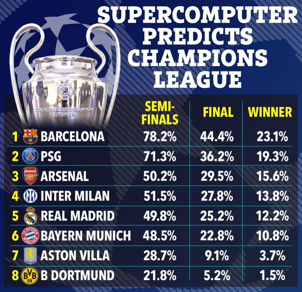 4月8日讯 欧冠1/4决赛首回合,阿森纳主场对阵皇马,拜仁主场对阵国米。赛前,超算预测了欧冠晋级概率。