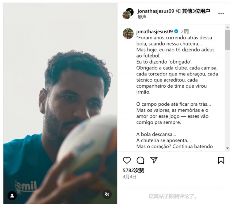 4月21日讯 36岁巴西前锋若纳塔斯更新社媒动态,宣布结束职业生涯。