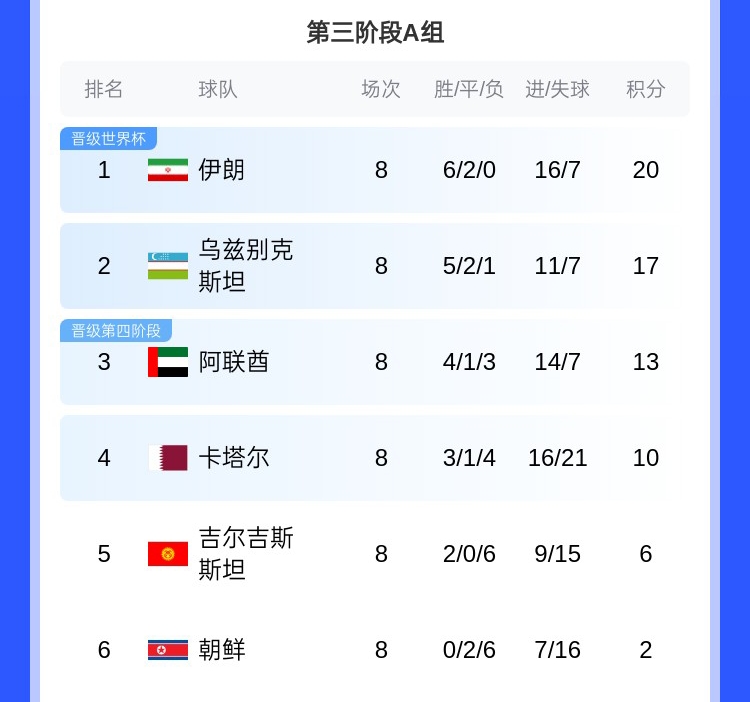 A组伊朗在阶段保持不败,上轮已提前锁定直通名额,而排名第2的乌兹别克斯坦领先身后的阿联酋4分,本轮两队直接较量,乌兹别克斯坦不败即可锁定直通世界杯的名额,如果晋级将是他们队史首次参加世界杯正赛。