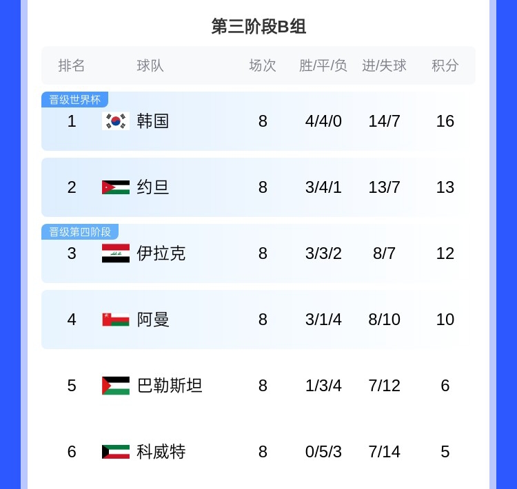 排名B组第二的约旦则希望韩国能够战胜伊拉克,本轮约旦对阵阿曼,如果韩国和约旦同时取胜,两队就将一起锁定直通世界杯的名额。