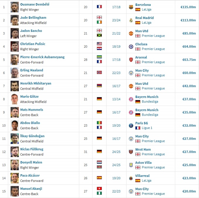 多特作为著名的球星加工厂,没有过大手笔买人的记录,他们更多的是选择引进有潜力的年轻球员,再从中赚取转会差价。多特此前的标王是3500万引进的登贝莱,球员转会至巴萨时多特收回了1.35亿欧的转会费。