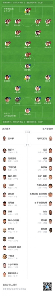 开罗国民首发:1-谢纳维、36-科卡、15-达里、6-易卜拉欣、30-哈尼、8-哈姆迪-法蒂、13-阿提亚、5-本-鲁姆赞、22-阿舒尔、7-特雷泽盖、9-阿博-阿里