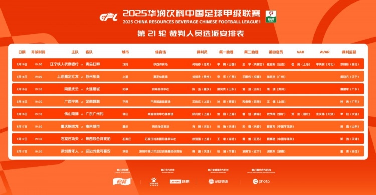 8月16日讯 中甲联赛第21轮裁判名单公布,其中辽宁铁人vs青岛红狮,佛山南狮vs广东广州豹两场比赛启用VAR。