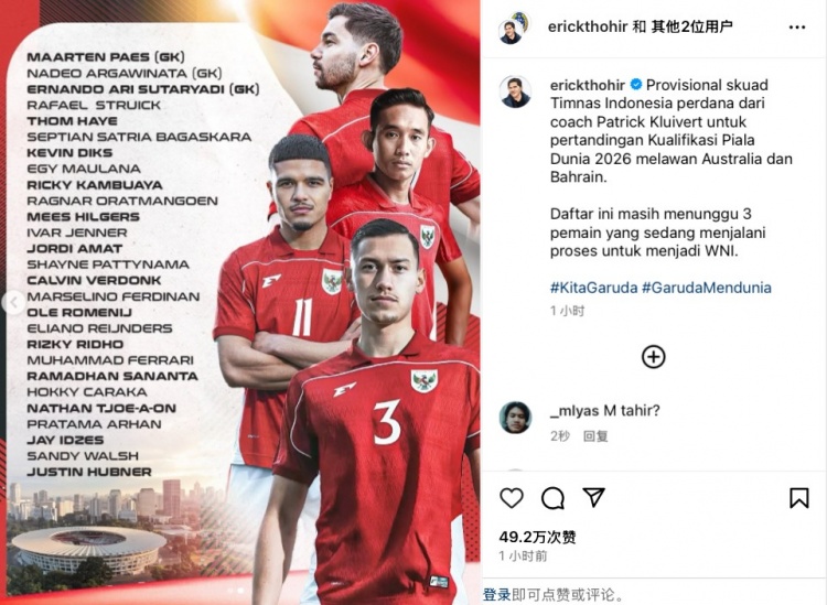 3月9日讯 今日,印尼足协主席托希尔更新社媒,晒出了印尼国家队3月份18强赛大名单,迪克斯、伊泽斯、哈耶、帕斯、小赖因德斯、费尔东克等归化球员悉数入选。
