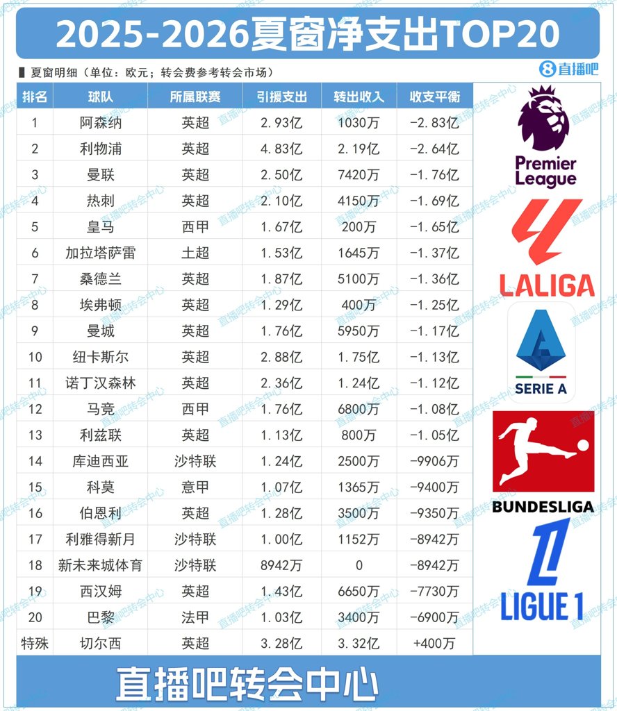 【转会中心】为吧友们总结了夏窗TOP20净支出【收支平衡】排行榜